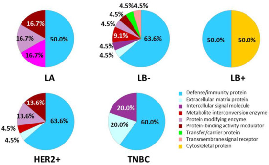 During the past decade, insight has been gained about the role of the immunological response in the BC disease process [21] and the possible use of immunological parameters in the prognosis of BC [22]. The PANTHER classification according to their protein class revealed that most of the differential proteins belong to defense/immunity (Figure 5). In the present work, from the 75 specific proteins identified for the different BC subtypes (n = 8 in LA; n = 27 in LB-; n = 2 in LB+; n = 28 in HE; and n = 10 in TNBC), 34 proteins were immunoglobulins (n = 3 in LA; n = 14 in LB-; n = 1 in LB+; n = 13 in HER2+; and n = 3 in TNBC) (see Table 2). Previous works also found that serum immunoglobulin levels were related to the disease stage and tumor load in BC patients [23].