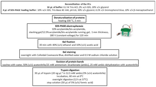 Corona proteins associated with AuNPs were separated by sodium dodecyl sulfate–polyacrylamide gel electrophoresis (SDS-PAGE) and digested following the scheme represented in Figure 6.