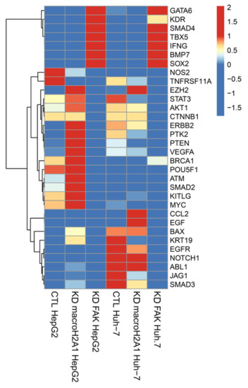 We found that macroH2A1 KD HepG2 cells, but not FAK KD HepG2 cells, displayed significant increase (p < 0.01) in the mRNA levels of master reprogramming transcription factors Oct-4 (POUF51) and MYC, as well as in many oncogenes (EZH2, STAT3, AKT1, ERBB2, PTK2, VEGFA, ATM, KITLG), compared to control cells (Figure 1) [18]. These differences were less marked or absent in Huh-7 cells (Figure 1). Moreover, we found that FAK KD HepG2 and Huh-7 cells, but not macroH2A1 KD HepG2 and Huh-7 cells, displayed a simultaneous significant increase (p < 0.01) in the mRNA levels of cancer stemness suppressor genes GATA6, SMAD4, and BMP7, and of tumor-promoting genes KDR and SOX2 (Figure 1). Finally, compared to macroH2A1 KD Huh-7 cells, FAK KD cells exhibited a significant reduction (p < 0.01) in the mRNA levels of tumor-promoting genes CCL2, EGF, BAX, KRT19, EGFR, NOTCH1, ABL1, and SMAD3 (Figure 1). Overall, these complex transcriptomic changes suggest that KD of macroH2A1 or of FAK triggers fairly polarized phenotypes, CSC-like (macroH2A1 KD) and anti-CSC (FAK KD), respectively, consistent with previous reports [17,18,19,21].