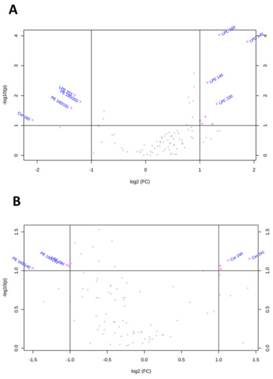 Changes of lipid species in Huh-7/HepG2 cells depleted for FAK. (A) Important features selected by volcano plot with fold change threshold 2 and t-tests threshold 0.1 in KD HuH-7 cells. (B) Important features selected by volcano plot with fold change threshold 2 and t-tests threshold 0.1 in KD HepG2 cells. Note both fold changes and p-values are log transformed.