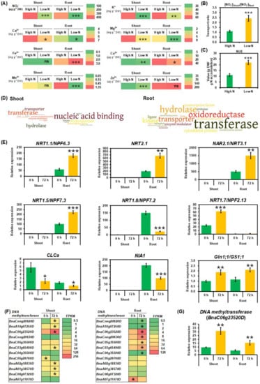 - Remans, T.; Nacry, P.; Pervent, M.; Girin, T.; Tillard, P.; Lepetit, M.; Gojon, A. A Central Role for the Nitrate Transporter NRT2.1 in the Integrated Morphological and Physiological Responses of the Root System to Nitrogen Limitation in Arabidopsis. Plant Physiol. 2006, 140, 909–921. [Google Scholar] [CrossRef] [PubMed]