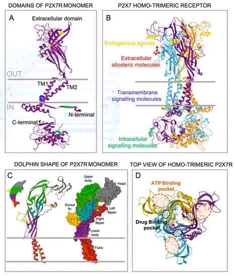 Topology of the P2X7 receptor (P2X7R). (A) Secondary structure of the P2X7R monomer with five domains; extracellular, transmembrane 1 (TM1), transmembrane 2 (TM2), intracellular N-termini, and intracellular C-termini. The colors into the domains represent possible specific molecular recognition sites. (B) Co-assembly of the three P2X7R monomers (purple, blue, and orange) position into the trimeric receptor showing possible surrounding molecules that could interact with the different domains, such as intracellular messengers at the N- and/or C- termini (green), membrane residues at the transmembrane domains (blue), and the endogenous agonist adenosine triphosphate (ATP, yellow) and/or other allosteric modulators (red) in the extracellular domain. (C) The P2X7 monomer represented as secondary structure (left) and molecular surface (right) styles resembling a dolphin. (D) Top view of the P2X7R structure embracing the three extracellular ATP-binding pockets (orange dashed lines) and the three additional drug-binding pockets (black dashed lines).