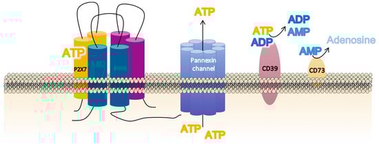 The final balance of extracellular ATP at a particular site of the cell, specifically surrounding the P2X7R, is not exclusively dependent on the amount of ATP released but also depends on the degree of ATP metabolism mediated by two cell-surface ecto-enzymes in a tightly regulated process [84]. Thus, the conversion of ATP into adenosine monophosphate (AMP) is catalyzed by CD39 (NTPDase-1) [85], whereas CD73 (ecto-5′-nucleotidase) catalyzes the dephosphorylation of AMP into adenosine [86] (Figure 2).