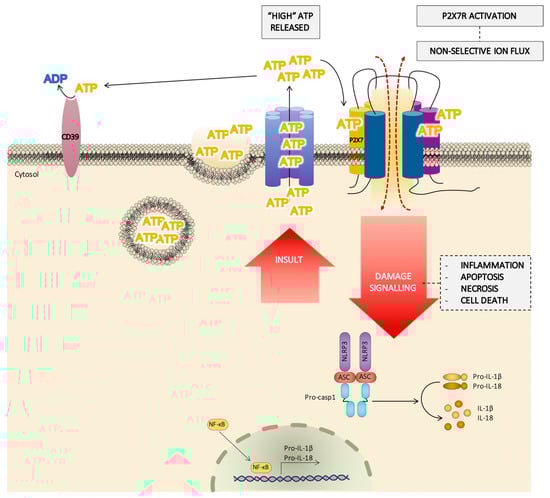 Schematic pathway of the role of the P2X7 receptor (P2X7R) in cell damage signaling. In response to a severe damage or an insult signal, the cell releases a huge amount of adenosine triphosphate (ATP) by different mechanisms (from ATP dense granules, ATP channels, …) and the extracellular concentration of ATP reached could be enough to activate the P2X7R, facilitating a flux of large ions and the activation of the inflammasome. The P2X7R/inflammasome complex induces the synthesis of IL-1β and IL-18, also regulated by NF-κB. This hypothesis agrees with the role of the P2X7R in processes such as inflammation, apoptosis, and necrosis.