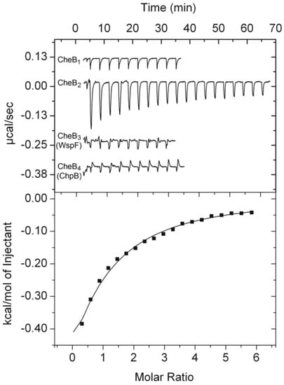 We subsequently overexpressed and purified P. atrosepticum CheB (CheB_Pec) to study its interaction with the pentapeptides present in SCRI1043 chemoreceptors. However, microcalorimetric titrations conducted with all nine pentapeptides (Table S1) and at different analysis temperatures did not show any sign of binding. This was an unexpected finding, since CheB_Pec shares 86% sequence identity with the E. coli CheB that was shown to bind in its unphosphorylated form the free or receptor-born NWETF pentapeptide [15,16,17]. To verify whether the N-terminal His-tag at CheB_Pec may potentially prevent binding, the His-tag was enzymatically removed from CheB, but no binding was observed in isothermal titration calorimetry (ITC). Since the phosphorylation of E. coli CheB greatly enhanced its methylesterase activity [17], we hypothesized that phosphorylation may be a necessary prerequisite for pentapeptide binding to CheB_Pec. To verify this hypothesis, we generated purified CheB_Pec containing a beryllium fluoride adduct that mimics phosphorylation [45,52]. However, microcalorimetric titrations did not evidence binding.