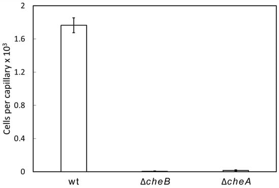 Quantitative capillary chemotaxis assays of wild-type and mutant strains of P. atrosepticum SCRI1043 towards 0.1% (w/v) casamino acids. Data were corrected with the bacteria that migrated into buffer-containing capillaries (225 ± 35). Data are means and standard deviations from three experiments conducted in triplicate. wt: wild-type.