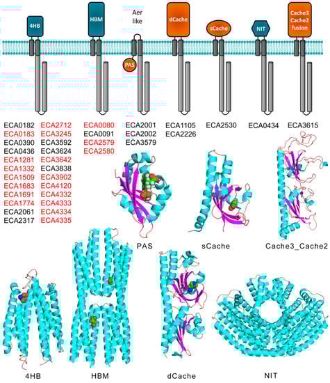 The chemoreceptor repertoire of P. atrosepticum SCRI1043. Ligand-binding domains with α/β folds or parallel helices are shown in orange or blue, respectively. Chemoreceptor names in red indicate receptors with C-terminal pentapeptides. Shown below are representative 3D structures of these domains, namely the structure of Tar-LBD (4HB) in a complex with aspartate (PDB ID: 1vlt), McpS-LBD (HBM) in a complex with malate and acetate (PDB ID: 2yfa), Aer2-LBD (PAS) in a complex with heme (PDB ID: 4hi4), TlpQ-LBD (dCache) in a complex with histamine (PDB ID: 6fu4), PscD-LBD (sCache) in a complex with propionate (PDB ID: 5g4z), NasR-LBD (NIT) (PDB ID: 4akk), and a homology model of the ECA3615-LBD (Cache3_Cache2 fusion) generated by SwissModel [48] using PDB ID 4avf as template.