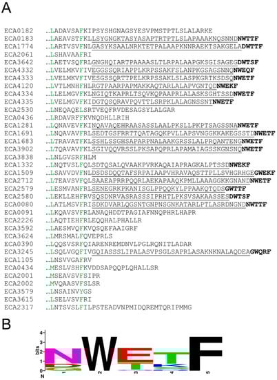 C-terminal pentapeptides at P. atrosepticum chemoreceptors. (A) C-terminal section of the sequence alignment of P. atrosepticum SCRI1043 chemoreceptors. Pentapeptides are in boldface, and the linker sequences are underlined. Residues in green are highly similar. (B) Sequence logo of the 19 pentapeptides. The figure was generated using Weblogo (https://weblogo.berkeley.edu/logo.cgi).