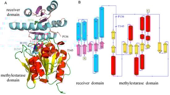 The three dimensional structure of P. atrosepticum CheB. (A) Ribbon diagram of the structure. The gap observed due to lacking electron density is indicated (P136 to T145). The phosphoryl group accepting aspartate (D56), as well as the residues that form the methylesterase catalytic triad (S165-H191-D287), are shown in stick mode. (B) Secondary structure elements: tubes: α-helix; arrows: β-strand. The figure was produced using PDBsum [53].
