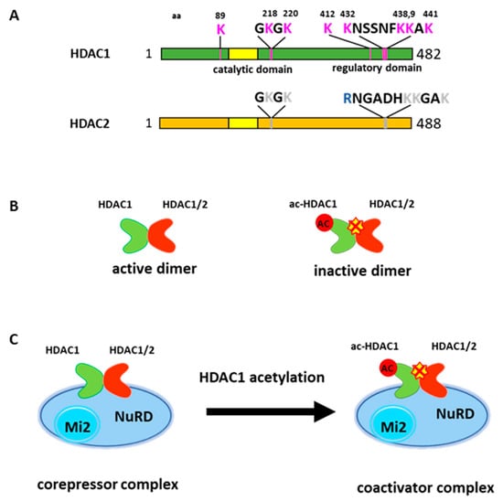HDAC1 and HDAC2 often coexist in multi-component protein complexes and are highly related enzymes [,,]. Interestingly, the major acetylation modifications of HDAC1 occur in the C-terminal domain, which reveals a lesser degree of homology to HDAC2. Further, the activity of HDAC2 is trans-repressed when forming heterodimer with acetylated HDAC1 [] (Figure 1B). Thus, HDAC1 acetylation results in the inhibition of overall deacetylase activity within HDAC1 containing complexes (Figure 1C).