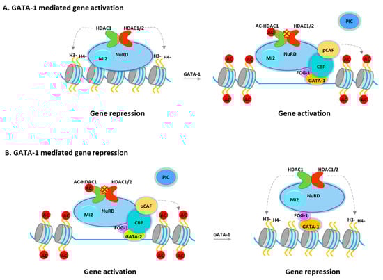 The transcriptional activity of GATA-1 is regulated through interactions with a variety of transcription factors and cofactors. GATA-1 interacts with TAL1, KLF1, PU.1, and SP1 (Sp1 transcription factor) []. GATA-1 has also been reported to interact with chromatin remodeling/modification proteins, including the CBP/p300 histone acetyltransferases, and the SWI/SNF (SWItch/Sucrose Non-Fermentable) chromatin remodeling complexes [,]. Recent studies showed that GATA-1 is associated with NuRD or MeCP1 corepressor complexes through its interaction with FOG-1 [,,] in either uninduced or induced terminally differentiated murine erytholeukemia (MEL) cells. It was suggested that these complexes play important roles in GATA-1 mediated repression of target genes such as GATA-2, c-Myc (Cellular myelocytomatosis oncogene), and c-kit (Mast/stem cell growth factor receptor Kit), which are all required for the proliferation of hematopoietic progenitors. However, the NuRD/MeCP1 complex is also recruited to GATA-1 sites, which mediate gene activation in induced cells, such as the β-globin gene, where GATA-1 binding also requires FOG-1 [,,]. Hence, the question will be how the corepressor complex regulates GATA-1 mediated gene activation. In fact, GATA-1-associated HDAC1 is increasingly acetylated after differentiation []. Consistently, overexpression of an HDAC1 mutant, which mimics acetylated HDAC1, promotes GATA-1-mediated transcription and erythroid differentiation. Furthermore, during erythroid differentiation, acetylated HDAC1 recruitment is increased at GATA-1-activated genes while decreased at GATA-1-repressed genes. (Figure 2) Interestingly, deacetylase activity is not required for Mi-2 remodeling activity, suggesting that remodeling activity may be required for both gene activation and repression. Therefore, NuRD can function as a coactivator or a repressor and that acetylated HDAC1 converts the NuRD complex from a repressor to an activator during GATA-1-directed erythroid differentiation (Figure 2). Notably, the NuRD complex become MBD2 free during erythropoiesis. Therefore, the complex that acts as a transcriptional coactivator may have different configurations to facilitate gene activation [].