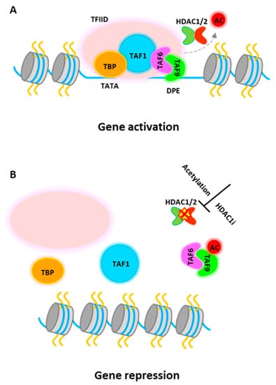 PU.1 gene expression can be regulated epigenetically [,,]. It is reported that inhibition of HDAC activity by HDACi treatment represses PU.1 gene expression [], although it is generally considered that HDACs associate with corepressor complexes and repress gene transcription. Recent study further demonstrates that PU.1 directly requires histone deacetylase activity for gene activation []. HDAC1 is recruited to active PU.1 promoter in progenitor cells to promote PU.1 gene transcription. Detailed study shows that TATA-box binding protein associated factor 9 (TAF9), a member of the TFIID complex, is a target for HDAC1-mediated deacetylation and this process is required for PU.1 gene activation. The transcription factor IID (TFIID) is the first complex to be recruited to the core promoter element for preinitiation complex (PIC) assembly and that also serves to mediate signals between various activators and the basal transcription machinery [,,]. TAF9 binds to a consensus DNA sequence, the downstream promoter element (DPE), which is found in both TATA-containing and TATA-less promoters, although more commonly in TATA-less promoters [,]. The study from Jian et al. shows that HDAC1 associates with TAF9 to maintain it in an unacetylated stage. The non-acetylated TAF9 is able to associate with the PU.1 promoter and promotes gene activation (Figure 3A). Upon induction of erythropoiesis, acetylated HDAC1 becomes accumulated at the PU.1 promoter and no longer be able to deacetylate TAF9. Acetylated TAF9 not only fails to bind to the promoter, but also results in the disassembly of the entire TFIID complex from the promoter, leading to transcriptional repression [] (Figure 3B). Thus, this study demonstrate a key role of HDAC1 in PU.1 gene transcription and more importantly, the study shows that acetylation of HDAC1 during erythropoiesis has multiple roles, turning on transcription activators such as GATA-1 or other activators, and turning off counter regulators, such as PU.1.