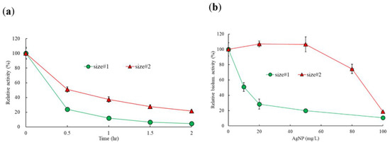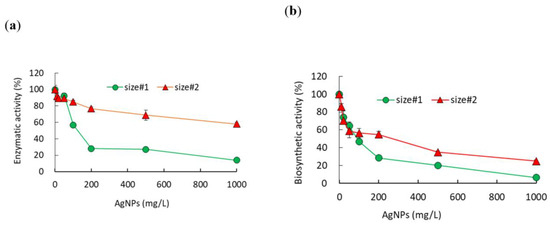 The effects of AgNPs on the enzymatic and biosynthetic activity of β-galactosidase were determined at up to 1000 mg/L of AgNPs (Figure 2). Both activities were determined by the color changes (yellow to redish) of chromogen in solution. The mean absorbance of the control (no AgNP exposure) for both activities was in the range of 1.68 to 1.79, and no stimulations were observed under all tested conditions. Enzymatic activity with size#1 decreased sharply from 92% to 28%, while a gentle decrease from 89% to 77% in activity was observed with size#2 at exposure concentrations of 50 and 200 mg/L (Figure 2a). In contrast to the enzymatic activity, the effects on the biosynthetic activity showed different patterns, changing from 64% to 29% and from 59% to 55% of the activity of the control for size#1 and size#2 at 50 and 200 mg/L, respectively (Figure 2b). At 1000 mg/L, the enzymatic activity appeared to be 14 ± 1.1% (86% toxicity) and 58 ± 2.1% (42% toxicity) for size#1 and size#2, respectively, showing about twofold higher toxicity for size#1 compared to size#2, while a greater effect on the biosynthetic activity compared to the enzymatic activity was observed, showing 7 ± 2.6% and 25 ± 1.3% of the control activity for size#1 and size#2, respectively. The EC50 values calculated for the enzymatic activity were 148 (125–176) mg/L and 1170 (930–1472) mg/L, while the values for the biosynthetic activity were 85 (70.2–99.8) mg/L and 131 (110–152) mg/L for size#1 (p = 0.0029) and size#2 (p = 0.0036), respectively (Table 1). The small particle sizes showed about 8- and 1.5-fold greater toxicity than the larger particles for the enzymatic and biosynthetic activity, respectively (Table 1).