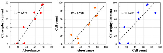 The effects of different sizes of AgNPs were evaluated at up to 100 and 200 mg/L of AgNP by the activity of three endpoints (absorbance, cell count, and chlorophyll content) for size#1 and size#2 particles, respectively. The average absorbance, cell count, and chlorophyll content of algal cultures of the control (no AgNP exposure) were shown as 1.9 × 106/mL, 1.17, and 5.95 g/m3, respectively. Correlation coefficients (R2) between two endpoints were observed as 0.723 (cell count/chlorophyll content), 0.788 (absorbance/cell count), and 0.876 (chlorophyll content/absorbance) (Figure 3). No stimulation of algal growth was observed under the conditions tested. Under the tested conditions for both particle sizes, relative activities of cell count, absorbance, and chlorophyll contents ranged from 12 to 98%, 22 to 88%, and 5 to 98% compared to the control, respectively (Table 2). A rapid decrease of activity was observed up to 50 mg/L of AgNPs, following slight changes of activity for both particle sizes. For example, the average activity for both particles was about 21% (toxicity 79%) at 100 mg/L AgNPs (Table 2). The EC50s calculated were 48 (42.2–53.8) mg/L and 60 (46.0–79.9) mg/L for size#1 and size#2, respectively. The small particle sizes (size#1) showed an about 1.3-fold higher inhibitory effect on algal growth than the large particle sizes (size#2) (p = 0.2778) (Table 2).