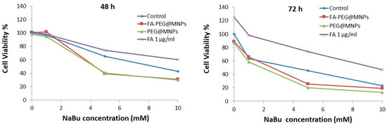 Figure 1 shows the viability of LoVo cells exposed for 48 h and 72 h to various concentrations of NaBu (blue line) as measured by the 3-(4,5-Dimethylthiazol-2-yl)-2,5-Diphenyltetrazolium Bromide (MTT) test. Viability of human colon adenocarcinoma cells in the presence of FA (violet line), or FA-PEG@MNPs (red line) or PEG@(MNPs (green line) together with the free formulations of NaBu are also shown. The effect of NaBu on LoVo cells was very significant as shown by the relevant decrease of the curves observed after 48 h and, even more evident after 72 h. From Figure 1 it is also evident that the reduction in viability is dose-dependent. On the other hand, for all NaBu concentrations, LoVo cells exposed simultaneously to both NaBu and folate (1 μg/mL) showed a greater vitality with respect to the cells treated only with NaBu. Therefore, folic acid protected cancer cells from the cytotoxic effect of NaBu.