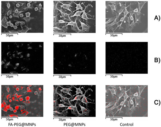 EDX maps show that the presence of Fe was evident in the cells treated with FA-PEG@MNP (Figure 2B,C). These results indicate a significant uptake of FA-PEG@MNPs into LoVo cells, whilst it was much less evident for samples treated with MNP without FA. In this case, the amount of Fe inside cells was greatly reduced (Figure 2B,C), in agreement with our previous paper [30].
