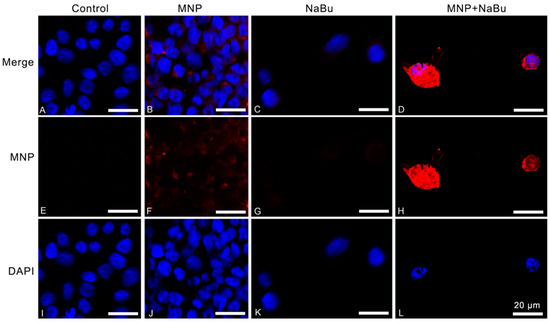 LoVo cells incubated with rhodamine-conjugated FA-PEG@MNPs and/or NaBu. (A): LoVo cells not exposed to FA-PEG@MNPs and/or NaBu (negative control). (B–D): LoVo cells incubated with MNPs, NaBu, and MNPs + NaBu, respectively. Red, and blue signals are due to rhodamine-conjugated FA-PEG@M, and to DAPI stained nuclei, respectively (E–H): the same images shown in A, B, C, and D, respectively, showing only the red fluorescence due to MNPs. (I–L): the same images shown in A, B, C, and D, respectively, showing only the blue fluorescence of DAPI staining the cell nuclei. Images were acquired with a Confocal Laser Scanning Microscopy using 405 and 555 nm wavelength lasers to detect the cell nucleus and the FA-PEG@MNPs, respectively. Scale bar: 20 μm.