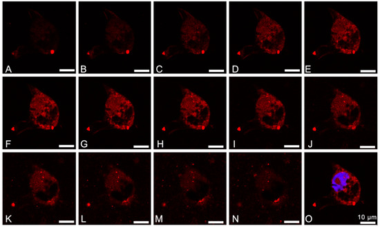 (A–N): Serial sections with 0.30 µm/section of a LoVo cell co-incubated with FA-PEG@MNP conjugated with rhodamine, and with NaBu. (O): Panel corresponding to the central serial section H with the visualization of the nucleus (stained in blue with DAPI). Scale bar: 10 μm.