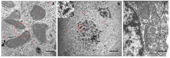 TEM micrographs of (A,B) LoVo cellular uptake of FA-PEG@MNP after 72 h of incubation, (C) control cells. A group of mitochondria (A) and the surrounding cytoplasm contain MNPs (red arrows). In the nucleus FA-PEG@MNP spreads between chromatin (red arrows). The magnified images (white dotted frame) of the area indicated by red circles. Scale bar: A = 0.6 µm, inset: 1.4×; B = 0.7 µm, inset 2.5×; C = 0.6 µm.