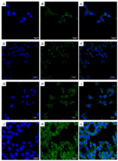 Folate receptors (FRs) analysis (CLSM) in LoVo cells incubated for 48 h (A–C) alone (control) and with (D–F) PEG@MNP, (G–I) FA-PEG@MNP and (J–L) FA used as a free formulation (1 μg/mL). In A, D, G and J nuclei are stained with DAPI (blue); B, E, H and K green florescence of FRs; in C, F, I, and L a merge was made. Scale bar 20 µm.