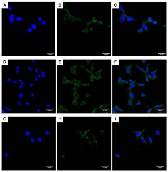 FRs analysis (CLSM) of LoVo cells incubated for 48 h (A–C) alone (control), and with (D–F) PEG@MNP or (G–I) FA-PEG@MNP in the presence of NaBu. In A, D and G nuclei are stained with DAPI (blue); B, E and H green florescence of FRs; in C, F and I a merge was made. Scale bar 20 µm.