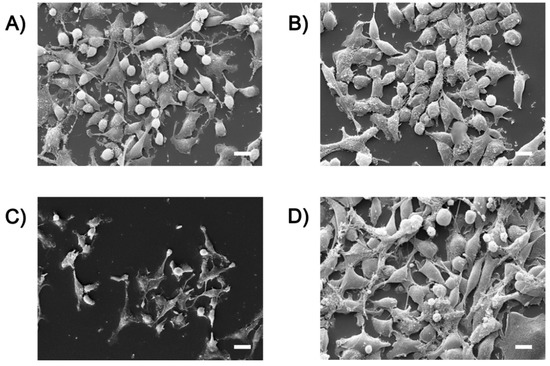 In this case, SEM observations indicated a reduced number of cells that were flattened and stretched on the surface with a smooth plasma membrane. Round cells of altered size and forms were also present, probably apoptotic bodies or misshapen cells.