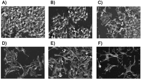 At 10 mM NaBu, butyrate-induced differentiation stopped the cell proliferation, thus determining apoptosis and detachment, especially in combination with MNPs. Consequently, SEM samples showed few cells and scattered cellular debris. A typical SEM image of LoVo cells incubated with PEG@MNPs and NaBu (10 mM) is shown in Figure S5. Due to the above-mentioned problems SEM analysis was performed at 1 mM NaBu. Figure 9A shows untreated LoVo cells (after 72 h) grown in vitro forming more or less confluent monolayers. The shape of the cells varied from flattened to rounded depending on their replicative stage. Similar pictures were observed when adenocarcinoma cells were exposed to FA-PEG@MNPs or PEG@MNPs (Figure 9B,C) without the addition of NaBu. Evident effects appeared when cells were exposed to the action of 1 mM NaBu (Figure 9D). Cell morphology was significantly modified as well as their number, and normal round cells, a sign of mitotic activity, were scarcely present. These features were probably due to the differentiating effect of NaBu. The cells were of various shapes and size, flattened on the substrate with cytoplasmic areas that extended in all directions. The plasma membrane was almost devoid of specialization and often seemed to swell to form small blebs. The combined treatment of FA-PEG@MNP and NaBu induced the same alteration as the cellular form, but the cells appeared less flattened, with a more three-dimensional appearance (Figure 9E). Following the simultaneous exposure to PEG@MNPs and NaBu, LoVo cells showed significant changes in shape and size and they appeared more stressed than with butyrate alone (Figure 9F).