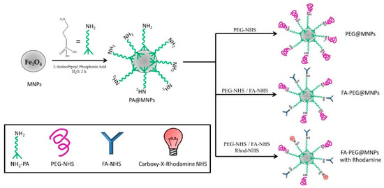 The functionalized MNPs used in this study were obtained adopting a multistep procedure [30,31] based on nanoparticle pre-functionalization with 3-aminophosphonic acids (NH2-PA) that is a bifunctional linker able to bind the Fe3O4 surface through its phosphonic acid group with the amine moiety available for other reactions. N-hydroxysuccinimide (NHS) activated PEG-acetic acid (PEG-NHS) alone or in a mixture (1:1) with NHS-activated FA (FA-NHS) were bonded to NH2-PA pre-functionalized MNPs (PA@MNPs) through an amide bond formation in order to obtain PEG@MNPs and FA-PEG@MNPs, respectively. The coating of FA-PEG@MNPs samples used for fluorescence measurements also contained a rhodamine luminescent probe. The overall synthetic route is reported in Scheme 1.