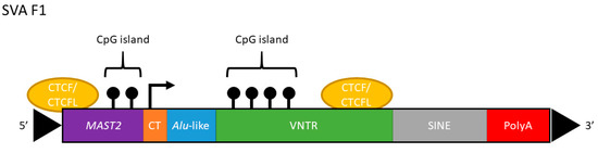 The canonical structure of the SVA F1 retrotransposon subclass, 5′ to 3′ displayed left to right. Purple: 5′ transduction of exon 1 of MAST2. Potential CCCTC-binding factor (CTCF) binding site and CpG island are displayed. Orange: The (CCCTCT)n hexamer repeat, which may be variable in copy number. Note, much of this sequence has been replaced by the MAST2 transduction. Blue: The Alu-like region, which is composed of two antisense Alu regions separated by a small intervening sequence. Green: The VNTR region which may be one or two regions of 35–50 bp tandem repeats, and may reach GC content of 70%. A CpG island is pictured, with black lollipops signifying 5-methylcytosine residues. A potential binding site for CTCF is shown. Grey: The SINE region is derived from the 3′ LTR of the retroviral HERV-K10 element. Red: The canonical polyadenylated tail can act as a signal for transcription termination but may be bypassed by RNA polymerase, and is thought to be important for SVA retrotransposition. Black arrowheads indicate target site duplication regions resulting from insertion.