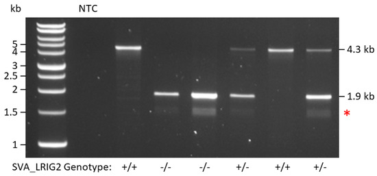 Representative image of NABEC DNA samples following PCR with primers targeting regions flanking SVA_LRIG2. A 1.9 kb PCR product corresponds to SVA_LRIG2 being absent from the locus and a 4.3 kb PCR product corresponds to SVA_LRIG2 presence. Sample genotypes are displayed along the bottom. NTC = Non-template control. Red asterisk indicates formation of non-specific PCR products of approximately 1.5 kb.