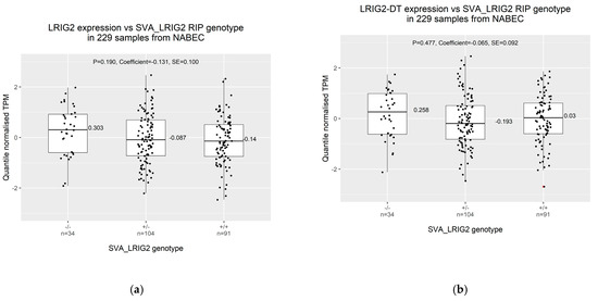 Having determined SVA_LRIG2 RIP genotypes experimentally or computationally, we assessed whether these genotypes correlated with transcription at the LRIG2 locus. Of the 288 individuals in NABEC with validated or imputed SVA_LRIG2 genotypes, frontal cortex total RNA-seq data were available for 229. Expression values, expressed as quantile normalised transcripts per kilobase million (TPM), were extracted for LRIG2 and LRIG2-DT. These expression values were stratified on the basis of SVA_LRIG2 RIP genotype, resulting in 34 individuals of the genotype SVA_LRIG2 −/−, 104 that were SVA_LRIG2 +/− and 91 that were SVA_LRIG2 +/+. Compared to those with no copies of SVA_LRIG2 (−/−), individuals with the RIP genotype SVA_LRIG2 +/− displayed a median expression of LRIG2 that was 0.390 standard deviations lower and those with SVA_LRIG2 +/+ were 0.443 lower in the quantile normalised data (Figure 4a). Similarly, median expression of LRIG2-DT was 0.451 standard deviations lower in SVA_LRIG2 +/− individuals and 0.228 lower in SVA_LRIG2 +/+ individuals compared to those of genotype −/− (Figure 4b). A simple linear regression was used to assess whether SVA_LRIG2 was an expression quantitative trait loci in neurologically normal brain, i.e., whether increasing allele dosage of SVA_LRIG2 correlated with differential expression of LRIG2 or LRIG2-DT in the NABEC RNA-seq data. The linear regression model included the known covariates age, gender, ethnicity, originating brain bank and RNA integrity number. Alpha significance level was set at 2.94E-3 using Bonferroni correction for multiple comparisons (see Section 4). Although we found that SVA_LRIG2 RIP genotype was not significantly associated with expression of LRIG2 or LRIG2-DT (Figure 4, p = 0.190 and p = 0.477, respectively), our model indicated a negative trend between SVA_LRIG2 allele dosage and expression of both transcripts (Figure 4, negative coefficient values).