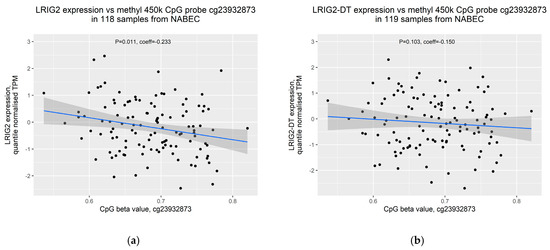 2.4. Increased Methylation of cg23932873 Is Weakly Correlated with Decreased Expression of LRIG2