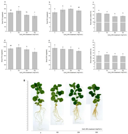 Fresh (a,b) and dry weights (c,d) augmented with the water content (e,f) in green pea plants after 12 days cultivation in Hoagland solutions supplemented with nanoparticulate CeO2 at the 0–500 mg/L of Ce concentrations. Data represent averages over six replicates, standard deviations are represented by vertical bars. Letters in each variable indicate statistical differences among treatments as evaluated by the Tukey’s post hoc test (α = 0.05). Roots and shoots were treated separately. Pea plant morphological changes (g).