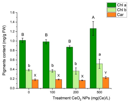 Contents of chlorophyll a (Chl a), chlorophyll b (Chl b), and carotenoids (Car) in green pea cultivated in Hoagland solutions supplemented with CeO2 NPs. All pigments were extracted from mature leaves. Distinct letters indicate statistically significant differences as evaluated by the Tukey’s post hoc test (α = 0.05).