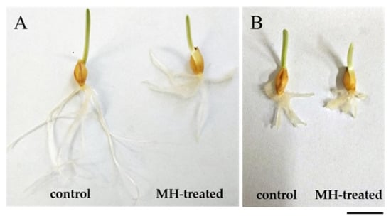The representative 3-day-old seedlings of barley: cv. “Sebastian” (A) and hvatr.g mutant (B): control and treated with 4 mM MH. Bar 1 cm.