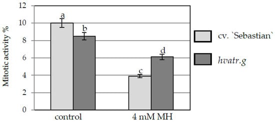 Mitotic activity of root cells of barley seedlings of the hvatr.g mutant and cv. “Sebastian”, control and MH-treated. Error bars represent the standard deviations of the mean. Statistical analyses were performed using ANOVA (p < 0.05) followed by Tukey’s honestly significant difference test (Tukey HSD test, p < 0.05). Statistically significant differences are indicated by different letters.