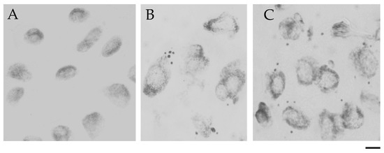 Cytological effects of MH in root cells of barley seedlings of the cv. “Sebastian” and hvatr.g mutant. (A) Control nuclei without micronuclei; (B,C) Nuclei with micronuclei after MH treatment: (B) cv. “Sebastian” (C) hvatr.g mutant. Bar 20 µm.