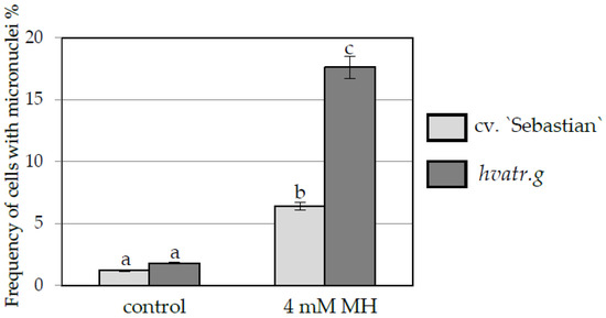 Frequency of cells with micronuclei in root of barley seedlings of the hvatr.g mutant and cv. “Sebastian”, control and MH-treated. Error bars represent the standard deviations of the mean. Statistical analyses were performed using ANOVA (p < 0.05) followed by Tukey’s honestly significant difference test (Tukey HSD test, p < 0.05). Statistically significant differences are indicated by different letters.