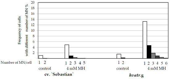 Similar low levels of cells with micronuclei were observed in the control “Sebastian” and hvatr.g mutant roots (1.2% and 1.8% respectively). A significant increase in the frequency of cells with micronuclei was observed after 4 mM MH treatment, namely to 6.4% in “Sebastian” roots and to a much higher level, 17.6% in hvatr.g roots (Figure 4). In the cells that possess micronuclei, their number was evaluated. It ranged from 1 to 2 in control roots of “Sebastian” and hvatr.g mutant, while after MH treatment it increased up to 5 in “Sebastian” and 6 in hvatr.g roots (Figure 5).