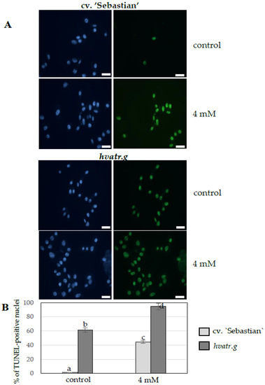 The TUNEL (terminal deoxynucleotidyl transferase-mediated dUTP nick-end labeling) reaction was applied for the analysis of MH-induced DNA fragmentation. Control and MH-treated roots of the hvatr.g mutant and “Sebastian” were fixed in freshly prepared 4% paraformaldehyde (Fluka) in PBS (phosphate-buffered saline) for 1 h, at RT, and then washed 3 × 5 min in PBS. The nuclei preparations were made by squashing the meristematic tissue in the PBS buffer. After freezing at −70 °C, the slides were stored at 4 °C for several days. Prior to the TUNEL reaction, the slides were air-dried, permeabilized by incubating in 0.1% Triton X-100 (Sigma) in 0.1% sodium citrate at 4 °C for 2 min and were rinsed in PBS. For the positive control, a slide was treated with a DNAse solution (1U) for 30 min at 37 °C in a humid chamber. DNA fragment labelling was carried out with the TUNEL reaction mixture (in situ Cell Death Detection Kit, Fluorescein, Roche) containing an enzyme solution (terminal transferase) and a label solution (FITC labeled nucleotides). Next, 50 µL of the TUNEL reaction mixture (enzyme solution: label solution, 1:9 v/v) was applied to the preparations and incubated in a humid chamber for 1 h at 37 °C in the dark. As a negative control of the TUNEL reaction, a reaction mixture without any enzyme was used. The preparations were rinsed 3× in PBS and stained with DAPI (2 µg/mL), air dried and mounted in a Vectashield medium (Vector Laboratories). The frequency of TUNEL-positive nuclei was analyzed. The treatment experiment was carried out in two biological repetitions, with three plants per repetition and two roots per plant. The frequency of FITC-labelled nuclei in the TUNEL test was established based on the analysis of 2000 cells on each slide (each made from one root meristem). Preparations were examined with a Zeiss Axio Imager.Z.2 wide-field fluorescence microscope equipped with an AxioCam Mrm monochromatic camera. Statistical analyses were performed using ANOVA (p < 0.05) followed by Tukey’s honestly significant difference test (Tukey HSD test, p < 0.05).