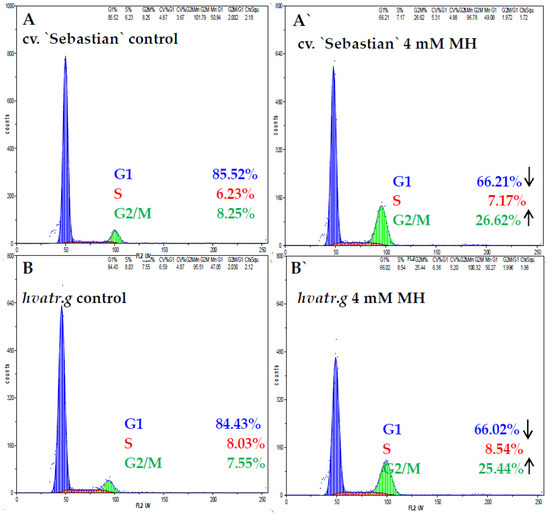 Flow cytometry analysis was used to evaluate the effect of MH on the cell cycle in meristematic root cells of both genotypes. Cell cycle profiles were similar in the control “Sebastian” and hvatr.g mutant roots (Figure 7). The frequency of the control root meristematic cells in the G1 phase was about 85% in both “Sebastian” and hvatr.g mutants. Only 6.2% of “Sebastian” cells and 8.0% of mutant cells were in the S phase and in the G2—7.5% and 8.2%, respectively. After treatment with MH the cell cycle profiles changed, although they did not differ from each other in the “Sebastian” and hvatr.g mutants. Root cells were still predominantly in G1, however the frequency of G1 cells decreased to about 66%. At the same time the frequency of cells in G2/M significantly increased in both genotypes.