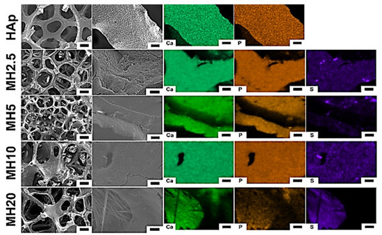 Surface morphology (left) and chemical elements (right) of porous hydroxyapatite (HAp) and MH groups. Element mapping analyses were performed for calcium, phosphorous, and sulfur. Low magnification (100×) images: scale bar is 200 μm, high magnification (1000×) images: scale bar is 10 μm.