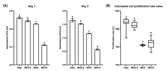 Cell proliferation and calculated proliferation rate in the HAp and MH groups from day 1 to day 3 are shown in Figure 3. The cell proliferation rate in the HAp group was not significantly different from that in the MH2.5 group (p > 0.05). Meanwhile, there was a significant increase in the cell proliferation rate in the MH2.5 group compared with that observed in MH5 and MH10 groups (p < 0.05).