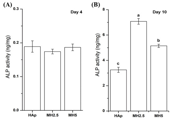 The ALP activity of MC3T3-E1 cells from HAp and MH groups on day 4 and day 10 was assessed. The ALP activity of HAp and MH groups was not significantly different at day 4. However, the ALP activity of MH2.5 group was significantly higher than that of HAp and MH5 groups at day 10 (p < 0.0001), while the ALP activity of MH5 was significantly higher than that of HAp (Figure 4).