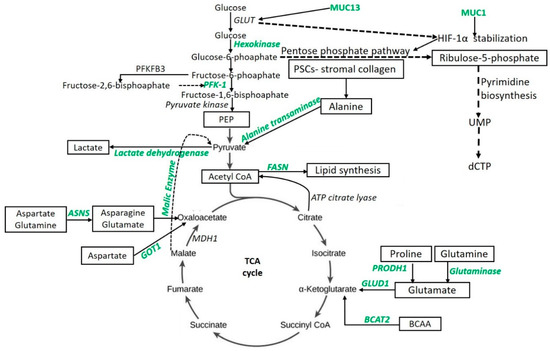 The switching of glucose to glutamine metabolism in MUC1 overexpressing cells during glucose deprivation has been reported in PDAC cells. This switching to glutamine metabolism was associated with decreased cell proliferation, G1 phase arrest, decreased DNA synthesis, and disruption in pyrimidine nucleotide biosynthesis, leading to a significant accumulation of glutamine-derived aspartate in MUC1 overexpressing cells (S2−013) [42]. Abrego et al. [18] reported that, in low-pH conditions, PDAC cells deviate from glycolytic metabolism and rely more on oxidative metabolism facilitated by increased expression of the aspartate aminotransferase (GOT1) enzyme (Figure 1) and enhance the non-canonical glutamine metabolic pathway. The results from this study suggest the key role of GOT1 in PDAC cell (S2−013 and Capan-1) survival in chronic acidosis and anaplerotic glutamine metabolism as a key therapeutic target for PDAC treatment. Thus, targeting the glutamine metabolism might serve as novel therapeutics for the treatment of PDAC.