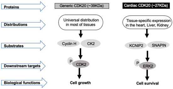 Although the regulatory signaling pathways by which CDK20 mediates cell survival are not fully understood, it appears that this effect relies on the unique variant expressed in the specific cells. Increasing evidence reveals that CDK20 exists as a few alternative RNA splicing, and more new variants are being discovered. According to the most recent updated information from NCBI resources (Gene ID: 23552, updated on 1 June 2020), there are at least seven transcription variants in mammalian cells. Among these reported variants, two identified proteins with a molecular weight 27 KDa or 39 KDa, respectively [16,47,49], attracted the most attention because of their unique tissue and cellular distributions and their distinct functions as well as their close link with the development of cancers and heart diseases. As shown in Figure 2, these two isoforms differ in tissue distribution, substrates, and protein interaction. While the "generic" isoform can be found in most tissues, the smaller variant can only be found in some specific tissues, such as the heart, liver, and kidneys [47].