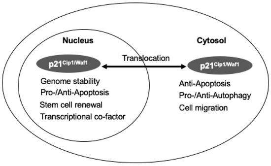 The dual function of p21Cip1/Waf1 depends on the subcellular distribution. Functions of p21Cip1/Waf1 are different in the nucleus and cytosol localization. The nucleus p21Cip1/Waf1 maintains genome stability, regulates apoptosis, involves stem cell renewal, and acts as a transcriptional co-factor, while the cytosol p21Cip1/Waf1 binds to caspase to inhibit apoptosis and regulate autophagy.