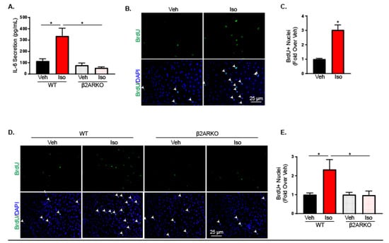 IL-6 has been shown to influence a number of fibroblast activities including migration [30], myofibroblast differentiation [31,32,33] and proliferation [34]. To determine the functional significance of β2AR on cardiac fibroblasts, various potential outcomes were examined in RNCFs treated with isoproterenol or in WT and β2ARKO AMCFs. A scratch wound healing assay was used to investigate RNCF migration with or without isoproterenol and demonstrated no impact of βAR activation on fibroblast migration (Supplemental Figure S2A,B). Additionally, isoproterenol did not alter α-smooth muscle actin expression in the presence or absence of TGF-β, a driver of myofibroblast differentiation, indicating that β2AR is not involved in myofibroblast conversion (Supplemental Figure S2C). Furthermore, fibroblast migration (Supplemental Figure S2D,E) and α-smooth muscle actin expression were unaltered in β2ARKO AMCFs when compared with WT (Supplemental Figure S2F) and demonstrated that the lack of β2AR in adult cardiac fibroblasts had no impact on migration or myofibroblast conversion. Staining for bromodeoxyuridine (BrdU) incorporation was performed to identify replicating cells and demonstrated increased proliferation with isoproterenol administration in RNCFs (Figure 1B,C). This was also confirmed using Ki67 staining to identify mitotic cells (Supplemental Figure S3A,B). Furthermore, AMCFs isolated from WT and β2ARKO mice showed an increase in proliferation in WT AMCFs treated with isoproterenol, which was blunted in AMCFs null of β2AR signaling (Figure 1D,E).