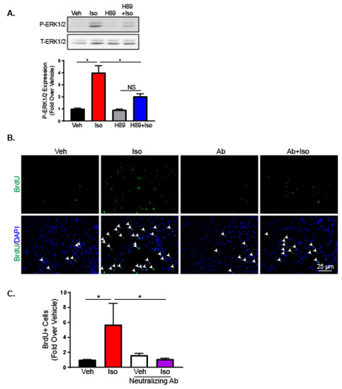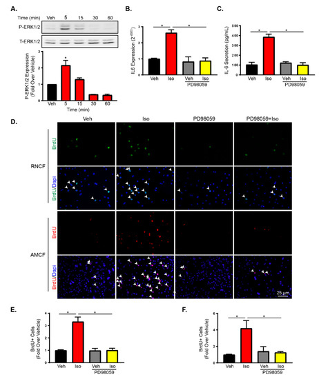 G protein-mediated signaling activates ERK1/2, leading to IL-6 production and proliferation. (A) Immunoblot for phospho-ERK1/2 of RNCFs pre-incubated with H89 followed by vehicle or isoproterenol treatment. Total ERK1/2 is shown as a loading control. n = 3, one-way ANOVA, * p < 0.05. NS = not significant. (B) Representative BrdU (green) staining alone (top) or merged with DAPI (bottom) and quantification of BrdU-positive cells (C) from AMCFs treated with vehicle or isoproterenol with or without pre-incubation with a neutralizing IL-6 antibody. Arrows indicate BrdU-positive nuclei. n = 8, one-way ANOVA, * p < 0.05.