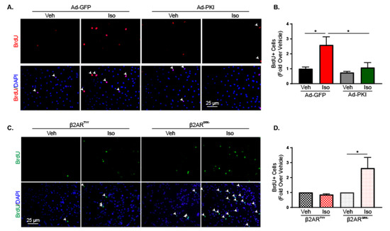 Gαs-mediated signaling alters proliferation in response to β2AR activation in cardiac fibroblasts. (A) Representative BrdU (red) staining alone (top) or merged with DAPI (bottom) and quantification of BrdU-positive cells (B) from Ad-GFP or Ad-PKI transduced RNCFs treated with vehicle or isoproterenol. Arrows indicate BrdU-positive nuclei. n = 5, one-way ANOVA, * p < 0.05. (C) Representative BrdU (green) staining alone (top) or merged with DAPI (bottom) and quantification of BrdU-positive nuclei (D) from vehicle and isoproterenol-treated β2ARKO AMCFs that were transduced with β2ARTYY or β2ARGRK- lentivirus. n = 6, one-way ANOVA, * p < 0.05.